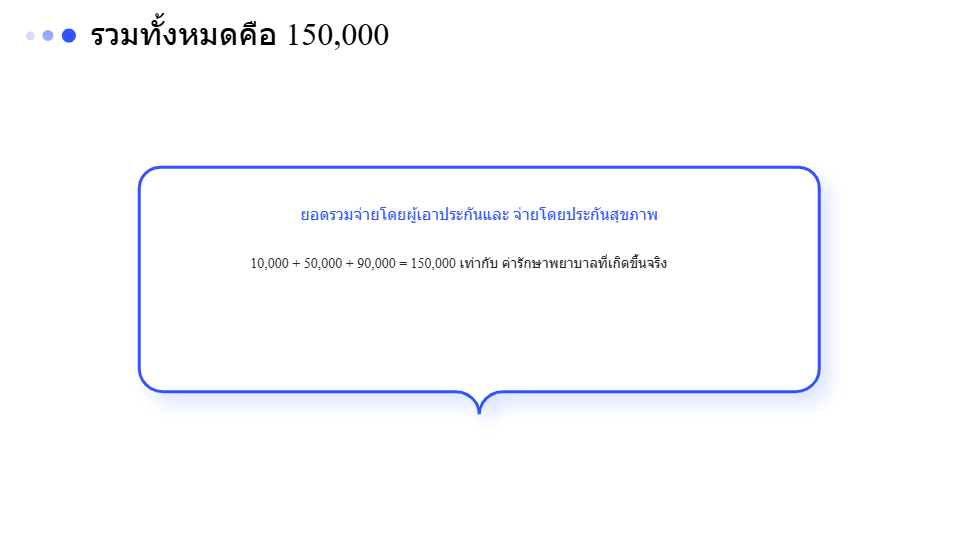 ยอดรวมจ่ายโดยผู้เอาประกันและ จ่ายโดยประกันสุขภาพ 10,000 + 50,000 + 90,000 = 150,000 เท่ากับ ค่ารักษาพยาบาลที่เกิดขึ้นจริง